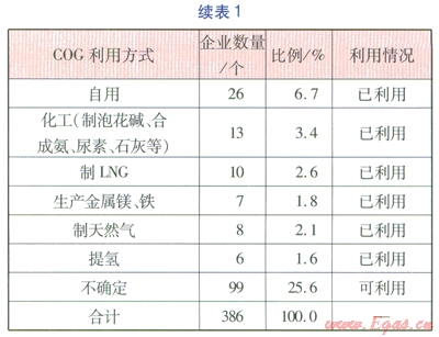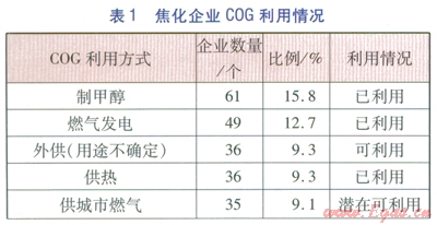 截至2012年中,符合《焦化行業(yè)準(zhǔn)入條件》的企業(yè)共計6個批次,其利用情況主要為制甲醇、發(fā)電、外供(用途不確定)、供熱、供城市燃?xì)饧白杂脦讉€方面。據(jù)西南化工研究設(shè)計院有限公司所提供至2012年共計6個批次獲得準(zhǔn)入條件企業(yè)的利用情況,分析整理得到焦化企業(yè)COG利用情況(見表1)。