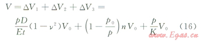 實踐中,對于式(10),由于徑向為管道壁厚方向,對于大口徑薄壁管,擘厚變化引起的管道體積變化較小,以規(guī)格為l219×22mm規(guī)格的管道為例,經(jīng)測算,僅為DVl的5%,若考慮空氣、水的壓縮性,該比例還將大大降低。因此,本文將該壁厚變化引起的體積變化忽略,得到DVl表達式為: