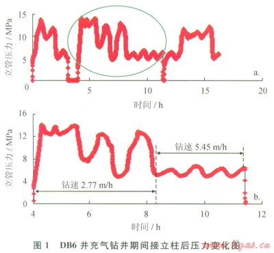 大出水地層接立柱時(shí),由于停止注氣井底大量積液,造成環(huán)空當(dāng)量密度升高,降低了氣體鉆井機(jī)械鉆速;同時(shí)注氣舉液壓力高、波動(dòng)大、時(shí)間長(zhǎng),給地面設(shè)備及管線帶來(lái)較大的安全風(fēng)險(xiǎn)。DB6井氣體鉆井期間地層出水量約74m3/h,鉆完1柱立柱大約需6h,而接立柱后注氣舉液至壓力穩(wěn)定約需4h,最高壓力14MPa(圖1-a),井底壓力穩(wěn)定前后鉆速相差1倍(圖1-b)。