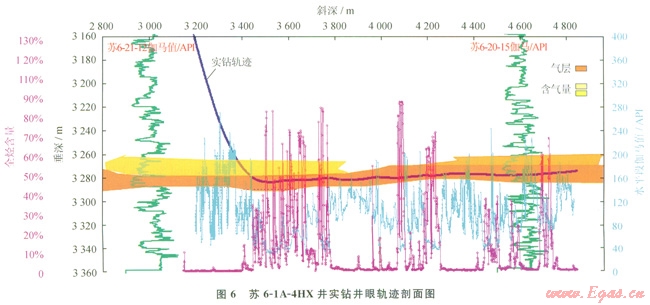 蘇里格氣田儲層含氣砂體薄,傾角變化大,LWD測點監(jiān)測儲層信息滯后于鉆頭位置,實鉆過程中井眼軌跡調整頻繁,砂體有效鉆遇率低。為提高氣層有效鉆遇率,提高鉆井速度,針對軌跡控制難題,通過鉆具力學分析與儲集砂體走向評價,改變了以往的鉆具組合,實施近鉆頭測量[14],形成了“精確監(jiān)控、緩慢糾偏、斜有余地、穩(wěn)斜探頂”的軌跡控制技術。該項技術能夠及時掌握實鉆軌跡,并根據(jù)地質提示提前做出調整,避免軌跡大幅度變化,降低了軌跡控制難度,提高了砂體有效鉆遇率,縮短了鉆井周期。2010年該技術在蘇61A-4HX井應用,實現(xiàn)了砂層鉆遇率85.6%,氣層(含氣層)鉆遇率67.6%的突破(圖6)。2011年該技術在蘇里格氣田實現(xiàn)規(guī)模應用,先后鉆井l63口,平均砂巖鉆遇率81.4%,氣層(含氣層)鉆遇率65.5%。