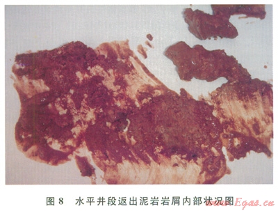 該體系2011年開始在水平井規(guī)模推廣,現(xiàn)場應用累計超過80井次,平均縮短水平井段施工周期5~8d,應用效果表明,無土相暫堵鉆(完)井液體系潤滑防卡性能好、低剪切速率下攜屑能力強,返出H泥巖巖屑內部呈干態(tài),表明抑制性良好,未出現(xiàn)吸水膨脹現(xiàn)象(圖8)。