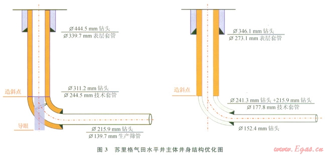 針對蘇里格氣田水平井Æ311.2mm鉆頭機械鉆速低、Æ203mm螺桿造斜率小、斜井段施工周期長、井壁穩(wěn)定性差等難題,通過理論研究和現(xiàn)場試驗,并參考井身結構設計方法[8]中套管與井眼之間環(huán)空的合理間隙[9],優(yōu)化形成蘇里格氣田水平井的彥273.1mmׯ177.8mm×裸眼的主體井身結構(圖3),表層井眼尺寸由Æ444.5mm優(yōu)化為Æ346.1mm,第二次開鉆使用尺寸Æ241.3mm的鉆頭鉆至造斜點,取消了導眼段,斜井段再采用Æ215.9mm鉆頭鉆至入窗點,下入Æ177.8mm技術套管,水平段優(yōu)化為Æl52.4mm井眼。