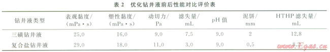 通過對“石千峰組、石盒子組”地層坍塌機理研究,從強化封堵、抑制膨脹和力學平衡三方面進行攻關,研制出CQSP-X強抑制無土相復合鹽鉆井液體系。體系配方為:1.5%SFT-1+1%SMP-2+0.3%CMC(PAC)+0.5%HL60+0.2%NaOH+0.5%CMS+4%~5%QS~4+10%~l5%KCI+10%WT-l。其豐要性能與三磺鉆井液體系對比如表2所示。可以看出,體系防塌能力強、潤滑防卡性能好、低剪切速率下攜屑能力強。