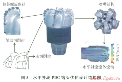 經(jīng)過對蘇里格氣田巖石可鉆性、鉆頭破碎規(guī)律進行分析,并結合巖心、測井等資料,針對硬夾層設計了雙重保護切削結構,減小鉆頭震動,提高鉆頭抗沖擊能力及耐磨性[12]。根據(jù)鉆頭水平井段鉆進時水平射流流體流動場,調整鉆頭噴嘴的方位角和噴射角度,增加鉆頭排屑槽面積,降低水力能量對切削齒和刀翼體的沖蝕。此外,根據(jù)水平井段施工穩(wěn)斜的需要,設計了短徑螺旋保徑5刀翼結構,減小PDC鉆頭反扭矩,提高鉆頭定向和穩(wěn)斜能力[13](圖5)。