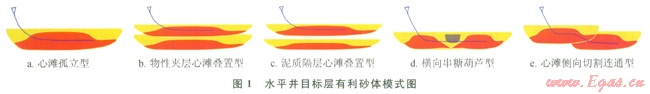 通過(guò)儲(chǔ)層精細(xì)描述,水平井部署區(qū)域地質(zhì)情況基本清楚,最終確定水平井目標(biāo)層。從蘇里格氣田沉積地質(zhì)特征來(lái)看,目前水平井部署主要有5種有利砂體模式:①心灘孤立型(圖1-a);②物性?shī)A層心灘疊置型(圖1-b);③泥質(zhì)隔層心灘疊置型(圖1-c);④橫向串糖葫蘆型(圖1 d);⑤心灘側(cè)向切割連通型(圖]-e)。根據(jù)部署區(qū)域砂體或疊置砂體類型情況,優(yōu)選出一種砂體模式或砂體模式組合作為水平井目標(biāo)層。