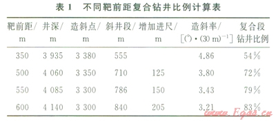 合理的靶前距可有效提高復(fù)合鉆井段比例,最大限度增加PDC鉆頭的使用井段,有助于提高機(jī)械鉆速;另外,合理的靶前距還可帶來(lái)最佳的造斜率,降低鉆具摩阻,有利于提高鉆井速度。總結(jié)水平井施工經(jīng)驗(yàn),推薦合理靶前距:水平段長(zhǎng)度小于l000m,靶前距350~400m;水平段長(zhǎng)度l000~1500m,靶前距400~450m;水平段長(zhǎng)度大于l500m,靶前距450~500 m(表1)。