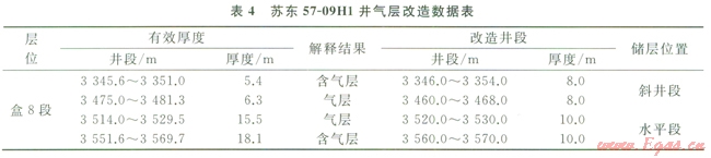 為實(shí)現(xiàn)多段儲(chǔ)層同時(shí)開(kāi)發(fā),使用水平段裸眼封隔器+斜井段傳輸射孔組合工具進(jìn)行多段儲(chǔ)層壓裂改造,既提高了儲(chǔ)量動(dòng)用程度,又提高了單井產(chǎn)量。以蘇里格氣田東區(qū)蘇東57-09H1井為例(表4),水平段有效儲(chǔ)層長(zhǎng)度僅97m,通過(guò)縱向斜井段與水平段儲(chǔ)層多段同時(shí)改造,試氣獲得無(wú)阻流量36.4×104m3/d,取得了顯著效果。