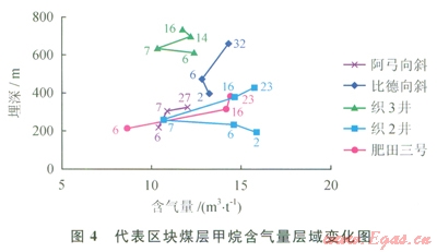 全區(qū)含氣量為0.48~32.69m3/t,平均為ll.90m3/t,各向斜以東部的關(guān)寨向斜最高,平均含量為15.47m3/t,比德向斜和珠藏向斜次之,平均含量分別為12.94、12.54m3/t,阿弓向斜最低,平均含量為10.15m3/t;氮?dú)夂坎桓?,一般小?span lang="EN-US">2m3/t;蕈烴平均含量0.75m3/t;全區(qū)甲烷含量以肥田二號(hào)最高,平均為l6.90m3/t。評(píng)價(jià)區(qū)總體顯示甲烷含量隨埋深的增加而增加,趨勢(shì)較為明顯,表明埋深對(duì)煤層氣含氣性具有重要的控制作用(圖3)。