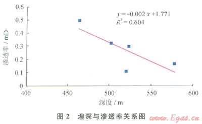 區(qū)內(nèi)比德向斜注入壓降法試井滲透率為0.1074~0.50016mD(表1),平均為0.279688mD,為中滲透率煤儲(chǔ)層;在層域上,滲透率和埋深的相關(guān)關(guān)系較好,滲透率隨埋深增大而減小(圖2)。三塘向斜織3井16號(hào)煤層及珠藏向斜織2井23號(hào)煤層儲(chǔ)層滲透率分別為0.000514mD、0.000164mD,均屬低滲透率煤儲(chǔ)層。