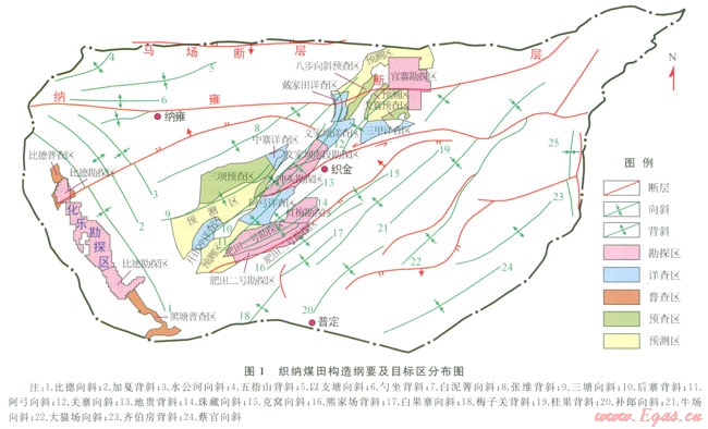 織納煤田位于貴州省中西部,主要包括比德向斜、三塘向斜、阿弓向斜、珠藏向斜、關(guān)寨向斜5個(gè)向斜單元,含煤面積約為l016.3km2,區(qū)內(nèi)煤田地質(zhì)工作程度高,除煤炭預(yù)測(cè)及預(yù)查區(qū)外,煤炭勘查面積達(dá)695.64km2,煤炭總資源量為90.33×108t;據(jù)貴州省煤田地質(zhì)局l996年提交的“貴州省煤層氣資源評(píng)價(jià)報(bào)告”[1],織納煤田煤層氣資源量為7611×108m3,但該區(qū)煤層氣的系統(tǒng)評(píng)價(jià)還很薄弱。因此,對(duì)煤出煤層氣資源狀況、賦存條件進(jìn)行全面分析和評(píng)價(jià),優(yōu)選煤層氣重點(diǎn)勘查和開發(fā)區(qū)塊很有必要[2-4]。