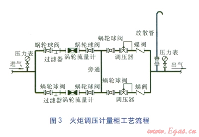 調(diào)壓計(jì)量柜內(nèi)安裝兩路調(diào)壓計(jì)量裝置,在兩路并聯(lián)的前提下增加旁通管將兩路裝置連接?;鹁嬲{(diào)壓計(jì)量柜工藝流程見(jiàn)圖3。燃?xì)庥?jì)量設(shè)施安裝于調(diào)壓器之前,一路采用工況(298.15K,0.26MPa)流量為l000m3/h的渦輪流量計(jì);另一路計(jì)量采用工況(298.15K,0.26MPa)流量為650m3/h渦輪流量計(jì):調(diào)壓器最大流量>4500m3/h。