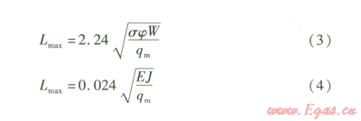 按強(qiáng)度條件計(jì)算,Lmax=19.95m;按剛度條件計(jì)算,Lmax=44.06m。