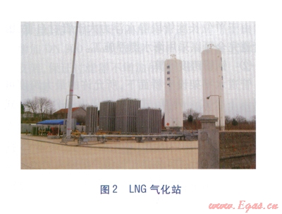 在長(zhǎng)輸管道通氣之前,LNG氣化站一直是海陽(yáng)旅游度假區(qū)的主要?dú)庠?。該氣化站是我公司?span lang="EN-US">2005年作為海陽(yáng)市招商引資項(xiàng)目投資建設(shè)的(見(jiàn)圖2)。主要設(shè)備有兩臺(tái)l00m3立式LNG儲(chǔ)罐,一臺(tái)2000m3/h空溫式氣化器,一臺(tái)2000m3/h水浴式氣化器,一臺(tái)200m3/h卸車(chē)增壓器,一臺(tái)400m3/h的BOG增壓器。日供氣量約10×104m3/d。將LNG氣化站作為氣源三,其出口壓力為0.27MPa,出口管道規(guī)格為SDRll PE80 NOD 250mm,距離火炬調(diào)壓計(jì)量柜約7km,與主氣源一、二配合完全可以滿足火炬高峰用氣量。