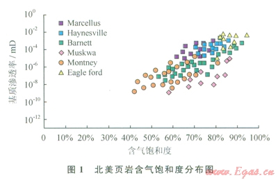 美國是頁巖氣開發(fā)利用最成功的國家,全美頁巖氣技術(shù)可采資源量為24.4×1012m3,投入商業(yè)開發(fā)的主要為海相頁巖,有Barnett、Marcellus、Antrim、Fayetteville、Woodford和Haynesville頁巖等[5]。2005年以來,隨著以水平井分段壓裂為代表的關(guān)鍵技術(shù)的突破,促進了美國頁巖氣產(chǎn)業(yè)的快速發(fā)展。據(jù)美國能源信息署預(yù)測,2015年美國頁巖氣產(chǎn)量將達到2600×108~2800×108m3,約占天然氣總產(chǎn)量的l/3[6-7]。北美地區(qū)凡是商業(yè)化的頁巖,其含水飽和度都很低,平均為l5%~35%[8-9],反之則含氣飽和度較高(圖1)。