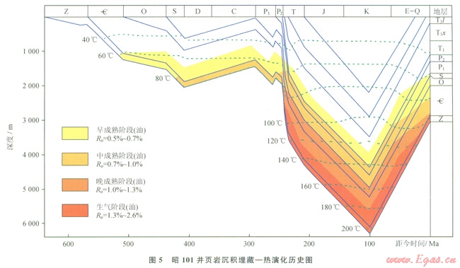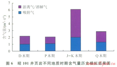 筆者以昭101井、l03等井為例開展了歷史模擬和流體包裹體分析,證實了斷裂對氣藏起強烈破壞這一判斷。昭通除靠近四川盆地的小部分區(qū)域外,多數(shù)鉆井都不成功,含氣量低(0.05~0.50m3/t)。昭通與蜀南相鄰,應(yīng)該大致經(jīng)歷了相似的演化歷程(圖5),含氣性差別大。昭101井位于芒部背斜,地表斷裂發(fā)育。目的層筇竹寺組因斷裂出現(xiàn)地層重復(fù),頁巖裂隙發(fā)育、方解石充填嚴重,含氣量的現(xiàn)場分析結(jié)果不足0.1m3/t,評價為極低含氣量,基本全部逸散。開展的昭101井熱演化歷史和含氣量歷史模擬研究表明:昭通地區(qū)J-K末期含氣量最大,如果穩(wěn)定抬升頁巖將出現(xiàn)超壓,含氣量應(yīng)該至少介于3~5m3/t,但是目前小于0.1m3/t(圖6)。