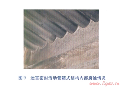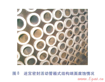 經(jīng)研究,認(rèn)為采用非金屬材料的迷宮密封結(jié)構(gòu)可以有效消除縫隙腐蝕的發(fā)生,迷宮密封活動(dòng)管箱式結(jié)構(gòu)見(jiàn)圖7。鍍搪瓷鋼管穿入迷宮密封套中(內(nèi)環(huán)面加工有迷宮鋸齒槽),迷宮鋸齒槽與鋼管外表面形成若干道迷宮腔,從而實(shí)現(xiàn)了密封。迷宮密封活動(dòng)管箱式結(jié)構(gòu)不但具有端面填料函密封的活動(dòng)管箱式結(jié)構(gòu)的優(yōu)點(diǎn),還由于換熱管與箱體板之間有柔性迷宮密封套隔離,避免了在安裝、運(yùn)行過(guò)程中對(duì)搪瓷層的破壞,從本質(zhì)上消除了縫隙腐蝕的發(fā)生[5]。經(jīng)技術(shù)改造后的空氣預(yù)熱器,連續(xù)運(yùn)行2年后運(yùn)行狀況依然良好,箱體板及換熱管各部位基本上沒(méi)有發(fā)生腐蝕(見(jiàn)圖8、9)。