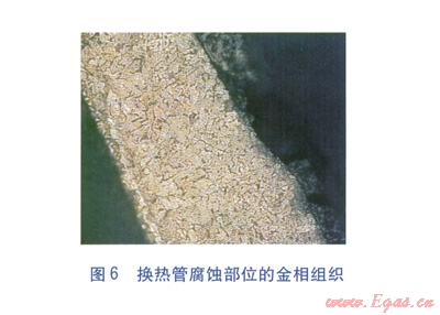 鍍搪瓷鋼管穿入箱體板中,壓板擠壓柔性石墨密封圈,以填充箱體板與換熱管間的填料函起到密封作用。與整體焊接的固定管箱式結(jié)構(gòu)相比,這種結(jié)構(gòu)一是可以削弱換熱管根部承受的交變應(yīng)力,二是可有效避免焊接導(dǎo)致的管道抗腐蝕性能的降低。經(jīng)過(guò)技術(shù)改造,使用壽命提高到l0~12個(gè)月。雖然技術(shù)改造后空氣預(yù)熱器的使用壽命有了一定延長(zhǎng),但效果仍不理想。通過(guò)現(xiàn)場(chǎng)勘察,技術(shù)改造基本杜絕了換熱管主體的酸露點(diǎn)腐蝕,腐蝕主要發(fā)生在換熱管與箱體板、柔性石墨密封圈接觸的部位(見(jiàn)圖5)。通過(guò)對(duì)換熱管腐蝕部位的金相組織(見(jiàn)圖6)分析發(fā)現(xiàn),腐蝕成因?yàn)榈湫偷目p隙腐蝕[3-4]。