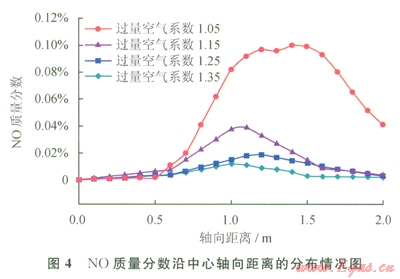 圖4為N0質(zhì)量分數(shù)沿中心軸向距離的分布情況,由圖4可知,a為1.05時,NO的峰值最大,其質(zhì)量分數(shù)達到0.11%,結(jié)合圖2的溫度分布可知,當a為1.05時,具有最高的溫度峰值,較高的溫度會促使熱力型NO的生成量增加;a為1.15時,NO的峰值為0.018%;a為1.25時,NO的峰值為0.039%;a為1.35時,NO的峰值為0.012%,可以看出NO的生成量與燃燒工況的溫度有較大的關(guān)系。NO的質(zhì)量分數(shù)隨著軸向距離的增加呈現(xiàn)出先增后減的趨勢,如a為1.05時,在X為1.0~1.6m區(qū)間NO的質(zhì)量分數(shù)最高,結(jié)合圖2可知該區(qū)間具有較高的溫度分布。4種過量空氣系數(shù)下爐膛出口處NO的質(zhì)量分數(shù)分別為0.0427%,0.00218%,0.000996%,0.000254%,從減少污染物排放的角度考慮,工況4(a為1.35)是最優(yōu)的,產(chǎn)生的NO含量最低。