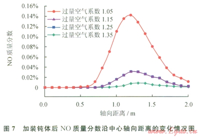 數(shù)值研究結(jié)果表明,加裝鈍體后甲烷的質(zhì)量分數(shù)在出口處為0,加裝鈍體能夠?qū)崿F(xiàn)頁巖氣的完全燃燒。加裝鈍體優(yōu)化后,燃氣噴出后遇到鈍體擾流,產(chǎn)生一定的回流區(qū)域,使高溫炯氣回流,并加熱剛噴出的燃氣,使其迅速燃燒,減少了著火時間。圖7為加裝鈍體后NO質(zhì)量分數(shù)沿中心軸向距離的變化情況,與圖4中未加裝鈍體優(yōu)化前進行對比,加裝鈍體優(yōu)化后,在相同位置處NO的質(zhì)量分數(shù)明顯降低,主要是由于加裝鈍體后,爐膛溫度有所降低,同時爐膛溫度較均勻。因此NO的生成量較少。