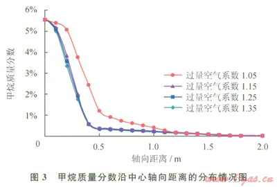 圖3反映了甲烷質(zhì)量分數(shù)沿中心軸向距離的分布情況。在爐膛的尾部,甲烷的質(zhì)量分數(shù)都幾乎為0,4種工況的甲烷轉(zhuǎn)化率都超過99.8%,其中,a為1.15、1.25、1.35這3種工況下的甲烷質(zhì)量分數(shù)變化最快,到X為0.60m處就幾乎燃盡,容易在燃燒器根部形成高溫區(qū)域;a為1.05時,甲烷質(zhì)量分數(shù)下降相對緩慢,在0.60m處達到1.2%。