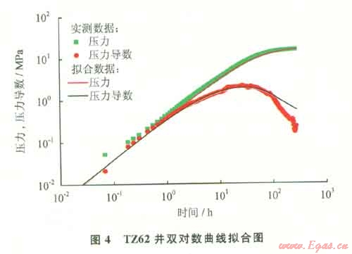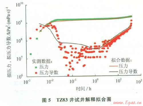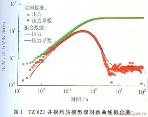如TZ621井,4851~4885m井段的儲層測井解釋孔隙度為2.66%,巖性為生屑砂屑灰?guī)r,針狀溶孔及小型溶蝕孔洞發(fā)育,主要發(fā)育Ⅱ、Ⅲ類儲層,儲滲綜合評價為孔洞型。試油期間,開井流動曲線近似一條水平直線,呈干層特征;初關井壓力恢復較快,表明地層滲透性較好(圖1)。壓裂后,用4.9mm油嘴生產(chǎn),折合日產(chǎn)油103.87m3,折合日產(chǎn)氣47320m3,效果顯著。試井解釋表現(xiàn)出典型的均質地層特征。由于廣泛發(fā)育洞穴,且洞穴內巖石充填較少,所以此類儲層的滲流條件非常好,試井解釋滲透率為270mD,初期產(chǎn)能高,但穩(wěn)產(chǎn)條件取決于洞穴的彈性空問大小以及與洞穴相連的儲集體儲滲能力的大小。該井自2004年12月8日到2011年3月10日關井前,累計產(chǎn)油9.9×104t,累計產(chǎn)氣4400×104m3。