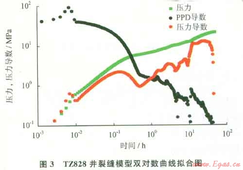 裂縫井模型也是塔中碳酸鹽巖儲層的主要類型之一,此類井由于基質孔滲條件差,能量補給不足,相應的產(chǎn)能低、遞減快。如TZ828井,5595~5603m儲層的沉積環(huán)境主要為粒屑灘、礁丘亞相,礁翼、中高能砂屑灘微相。巖性生屑砂屑灰?guī)r、層孔蟲骨架巖,含大量棘屑、發(fā)育溶洞、灰色生物礁灰?guī)r、見高角度構造縫和蜂窩狀溶蝕孔洞??紫抖绕骄禐?.8%,儲層類型以Ⅰ、Ⅱ類為主。試油期間開井流動曲線近似一條直線,開井期間地面無產(chǎn)出,表明地層無自噴能力;關井壓力曲線恢復緩慢,反映儲層為低滲透儲層。二次關井導數(shù)曲線后期出現(xiàn)不規(guī)則,是由于井筒相變的影響造成的,如圖3所示,試井解釋只能用10h以內的數(shù)據(jù)。