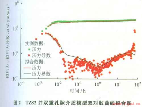 如TZ82井,5430~5487m井段測井解釋孔隙度為1.35%。沉積亞相為灰泥丘,微相為丘核與丘坪。在5430~5450m井段微相為丘坪,巖性為灰白色含砂屑泥晶灰?guī)r,大量晶洞全充填,少量半充填;5450~5490m井段微相為丘核,巖性為深灰白隱藻泥晶灰?guī)r,下部見大量晶洞被白色方解石充填。主要發(fā)育Ⅳ類儲層。試井解釋模型采用雙孔模型(圖2)。