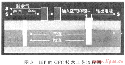 該工藝流程(圖3)為:利用高溫燃料電池堆的反應(yīng)熱直接加熱油頁巖層,使其中的有機(jī)質(zhì)熱解產(chǎn)生烴氣,然后導(dǎo)入到采油井,被抽到地面上來。除了部分氣體作為燃料被通入燃料電池堆外,其余大部分烴氣經(jīng)冷凝后獲得石油和天然氣。另外,在啟動(dòng)工藝裝置預(yù)熱油頁巖時(shí)期,需要向燃料電池中通入天然氣作為啟動(dòng)燃料。工藝正常運(yùn)轉(zhuǎn)后,能量自給自足[9]。