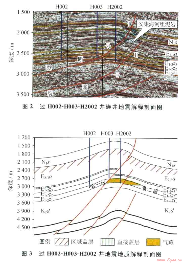 結(jié)合生產(chǎn)動(dòng)態(tài)資料,斷層兩側(cè)目的層紫二段均有砂體發(fā)育,斷層下盤H2002井在紫二段產(chǎn)氣,在斷層上盤的構(gòu)造高點(diǎn),新完鉆的評價(jià)井H003井海拔明顯高于H2002井,但在紫二段卻未見油氣顯示,試氣結(jié)果為干層,進(jìn)一步證明了l號(hào)斷裂具有較好的側(cè)向密封性。