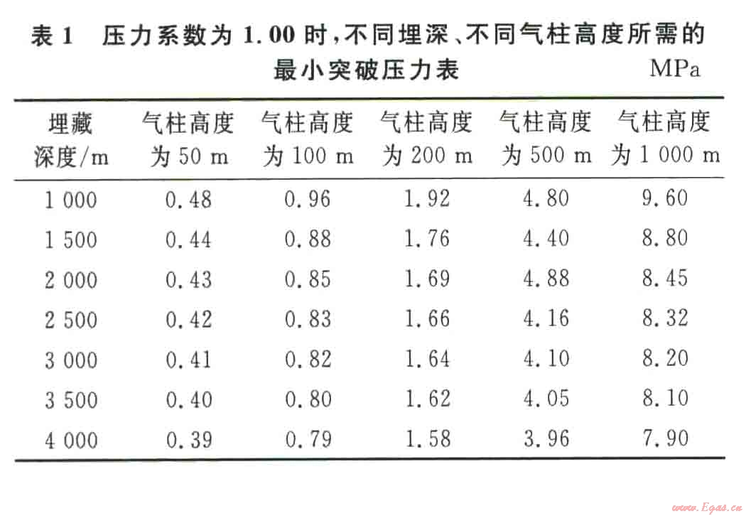 衡量蓋層封閉能力大小的直接標(biāo)志就是在一定地質(zhì)條件下封閉烴柱的高低,其可由突破壓力的大小獲得,同時(shí)與氣藏的壓力系數(shù)、埋藏深度也有關(guān)系。該區(qū)壓力系數(shù)為0.96,屬于正常壓力系統(tǒng),因此對應(yīng)的壓力系數(shù)選擇1.00;紫二段埋藏深度介于3500~3650m。根據(jù)不同埋深不同氣柱高度所需的最小突破壓力經(jīng)驗(yàn)值(表1),3500m埋深封閉200m氣柱高度需要的突破壓力不到2.0mPa,而該區(qū)實(shí)驗(yàn)分析所得上覆泥巖的突破壓力介于2.0~3.0mPa,故可封閉的氣柱高度大于200m,而儲(chǔ)層圈閉的幅度僅為180m,小于可封閉的氣柱高度,因此該區(qū)的泥巖蓋層對儲(chǔ)層是非常有效的,即當(dāng)圈閉完全注滿氣體時(shí),泥巖蓋層也可封閉紫二段儲(chǔ)層。