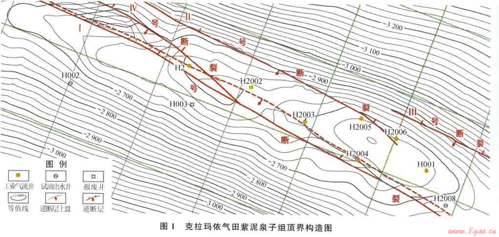 H氣田紫泥泉子組氣藏主要發(fā)育4條近東西向南傾的逆斷裂(圖1),其中斷穿紫泥泉子組地層的斷裂有3條:工號(hào)斷裂、Ⅱ號(hào)斷裂及Ⅲ號(hào)斷裂。