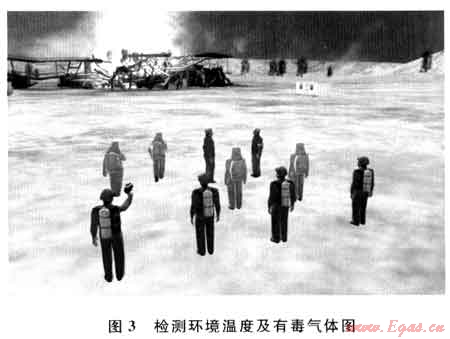該流程是滅火搶險(xiǎn)作業(yè)工藝流程的檢測(cè)環(huán)境溫度及有毒氣體的過(guò)程[5~7],通過(guò)仿真平臺(tái)模擬了溫度檢測(cè)及可燃?xì)怏w監(jiān)測(cè)的操作流程、同時(shí)展示了空氣呼吸器、抗高溫防火服及各種防爆工具的使用(圖3)。