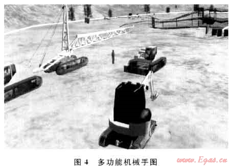 通過(guò)仿真平臺(tái)模擬展示了滅火搶險(xiǎn)作業(yè)的核心設(shè)備——多功能機(jī)械手隅7。,充分展現(xiàn)了罩引火筒、挖掘清障、剪切清障、破碎井場(chǎng)水泥基礎(chǔ),運(yùn)送遠(yuǎn)距離水力噴砂切割頭、吊裝單件井口裝置等功能(圖4)。