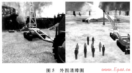 通過(guò)仿真平臺(tái)模擬井噴失控后帶火作業(yè)的帶火清障及井口清障過(guò)程[5~7],模擬搶險(xiǎn)隊(duì)員進(jìn)行切割、拖拉作業(yè),直到徹底清除井架底座,采用引火筒將散狀火焰集中引導(dǎo)垂直向上,完成滅火前井口周?chē)膹氐浊逭希?/span>使井口完全暴露,如圖5所示。