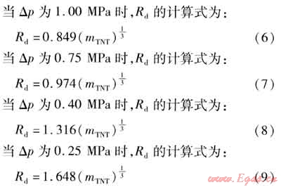 將表1中的沖擊波超壓代入式(5),可得到不同沖擊波超壓下的爆轟破壞半徑計算式。