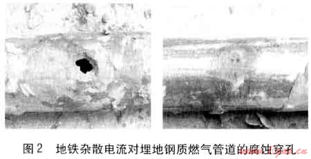 香港曾因地鐵雜散電流引起煤氣管道腐蝕穿孔,造成煤氣泄漏事故;北京、天津地鐵雜散電流已造成隧道內(nèi)水管腐蝕穿孔;據(jù)東北輸油管理局統(tǒng)計(jì),東北地區(qū)共有長輸油管道約2000km,其中80%的腐蝕穿孔事故來自雜散電流的影響[4]。地鐵雜散電流對埋地鋼質(zhì)燃?xì)夤艿赖母g穿孔見圖2,地鐵雜散電流對金屬管道的強(qiáng)烈腐蝕作用可見一斑。