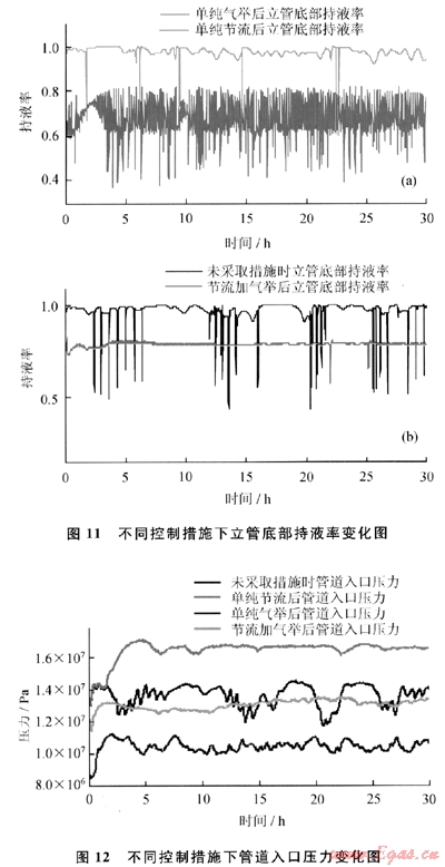 4)從模擬結(jié)果看,采取節(jié)流加氣舉法控制段塞流效果比單純節(jié)流或單純氣舉效果都更好,但提高油氣產(chǎn)量的效果不及單純氣舉法。當氣舉氣源不是很充足時,可予以考慮。