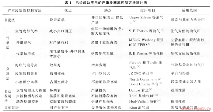 筆者將各種已成功應用于油氣田生產(chǎn)的嚴重段塞流控制方法進行了總結(jié),結(jié)果如表1所示。每種控制方法都有一定的適用范圍,隨著流體物性、海底路由、油氣田產(chǎn)量以及下游設施的不同而不同。應針對不同的工程項目,開展具體模擬分析,必要時可以結(jié)合多種方法來控制嚴重段塞流。