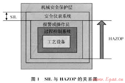 本文參考文獻(xiàn)[6-9]就SIL在不同SIS中的應(yīng)用情況,分析了SIL技術(shù)的評(píng)估方法、過(guò)程和應(yīng)用環(huán)境,不過(guò)都把SIL作為一種獨(dú)立的分析方法應(yīng)用在評(píng)估對(duì)象上。本文參考文獻(xiàn)[10]給出了SIL與HAZOP的關(guān)系圖,如圖1所示。圖1中SIL評(píng)估與HAZOP分析以明確的界限分隔開(kāi)來(lái),這種劃分是建立在保護(hù)層分析(LOPA)基礎(chǔ)上的。實(shí)際上,SIL評(píng)估的主要對(duì)象是安全儀表系統(tǒng),但是在驗(yàn)證SIL等級(jí)時(shí),是需要分析基本控制單元、系統(tǒng)報(bào)警和人工操作情況的,而HAZOP分析控制系統(tǒng)的防護(hù)措施時(shí)也會(huì)涉及安全儀表系統(tǒng),二者之間是存在交叉區(qū)域的。