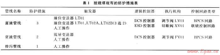 以某天然氣凈化廠的脫硫塔為例(該塔屬于重點(diǎn)高壓設(shè)備)。含硫天然氣在塔內(nèi)由下至上,在常溫高壓條件下脫除其中的硫化氫后從塔頂排出,脫硫溶劑貧液自塔頂往下流,吸收含硫天然氣中的硫化氫后從塔底排出,進(jìn)入低壓系統(tǒng)再生。為保證高壓介質(zhì)不竄入低壓系統(tǒng),除設(shè)置脫硫塔液位調(diào)節(jié)回路外,另設(shè)置了安全聯(lián)鎖控制回路,作為重要的防護(hù)層。該裝置現(xiàn)有防護(hù)措施如表1所示。