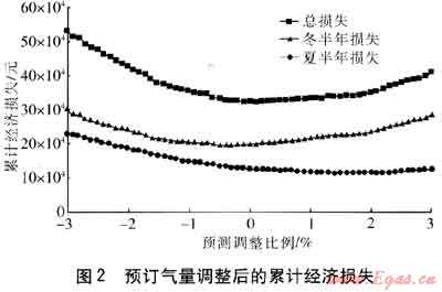 由圖2可知,在負(fù)調(diào)整比例區(qū)間,隨著燃?xì)忸A(yù)測(cè)調(diào)整幅度的增加,由于超提日數(shù)和超提氣量增加,超提損失的增長(zhǎng)速度明顯大于欠提損失的降低速度,總損失快速增加;在正調(diào)整比例區(qū)間,隨著燃?xì)忸A(yù)測(cè)調(diào)整幅度的增加,由于欠提日數(shù)和欠提氣量增加,欠提損失的增長(zhǎng)速度大于超提損失的降低速度,總損失逐步增加。冬半年經(jīng)濟(jì)損失與總經(jīng)濟(jì)損失變化趨勢(shì)基本相同,夏半年經(jīng)濟(jì)損失在調(diào)整比例為1.5%時(shí)最小。