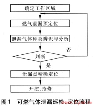 日常的巡檢可采用車載或便攜檢測設備確定工作區(qū)域,如發(fā)現(xiàn)泄漏還需對泄漏氣體進行種類辨識,排除其他氣體(如沼氣)的干擾。對已經(jīng)確定泄漏的管段可先實施對泄漏點的預定位,由在線檢測或日常巡檢確定泄漏的大致區(qū)域,再進行精確定位,如遇硬質(zhì)路面或在大片區(qū)域內(nèi)均檢測到高濃度可燃氣體,需結(jié)合路面鉆孔機和吸真空系統(tǒng)打孔定位。可燃氣體泄漏巡檢、定位流程見圖1。