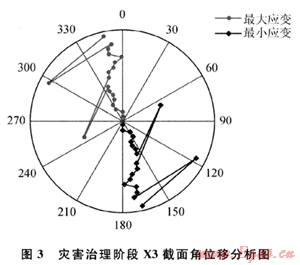 首先,管體應力釋放要控制在合理范圍內。一定長度內的管體應變既然已發(fā)生,就很難再回復到初始狀態(tài);過度的釋放有可能會加劇該管段的力學損傷,甚至影響相鄰管段的穩(wěn)定和安全。換言之,管體的應力釋放是以減緩并消弱災害風險為目標的,而不是像改線那樣去根除風險。治理階段的應變動態(tài)監(jiān)測可以控制應力釋放的程度。其次,管體應力的釋放要從低應變區(qū)逐段向高應變區(qū)迫近,而不是直接開挖管道變形最為劇烈的管段,否則有可能導致管體在卸載后大幅度振蕩,加劇管體損傷。隨著管溝的逐段開挖,該管段應力分布也會發(fā)生即時變化,此時的應變監(jiān)測數據可指導開挖進度和開挖位置調整。最后,采用管道應變監(jiān)測還可以獲得管線各監(jiān)測截面實時應變極值的角度(如圖3),即角位移分析。角位移分析圖能夠清晰地表明最大應力的方向、管道彎曲的方向,以及整個管段彎曲扭轉的狀態(tài)及趨勢,進而指導對管體進行細微的挪移。