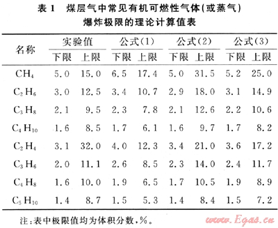 利用上述方法對煤層氣中常見有機可燃性氣體(或蒸氣)的爆炸極限進行了計算(見表1)。