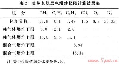 以貴州某煤層氣為例,利用以上方法計算了多組分煤層氣的爆炸上限和下限(見表2)。由表2可以看出,混合氣的爆炸極限與純氣體的爆炸極限有一定區(qū)別。