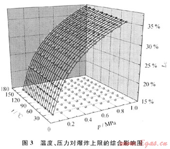 圖3給出了溫度和壓力對爆炸上限的綜合影響??梢钥闯鲭S著溫度、壓力的提高,爆炸極限范圍增大。在同一溫度下,壓力由0.1MPa升高到1.0MPa,其爆炸極限由15.14%擴大到35.74%。在同一壓力下,溫度由25℃升高到160℃,低壓時,爆炸上限幾乎沒有變化;在高壓時,爆炸上限由34.79%上升至35.74%??梢妷毫Ρㄉ舷薜挠绊懮跤跍囟葘ζ涞挠绊?。因此,在煤層氣的工業(yè)生產中,應盡可能在低壓下操作。