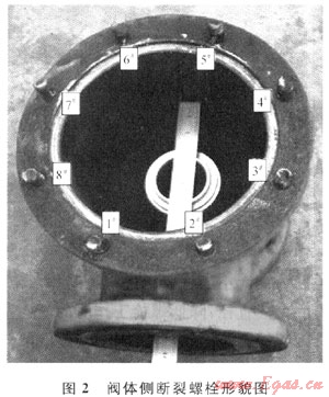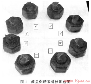 閥蓋上的8個螺栓光孔均發(fā)生了月牙形磨損或擠壓變形成為橢圓形,其中橢圓長軸沿徑中心。對光孔長軸和短軸進行測量并計算橢圓度,發(fā)現(xiàn)1#、2#、3#、8#光孔比4#、5#、6#、7#光孔橢圓度大(光孔編號與螺栓編號一一對應(yīng))。