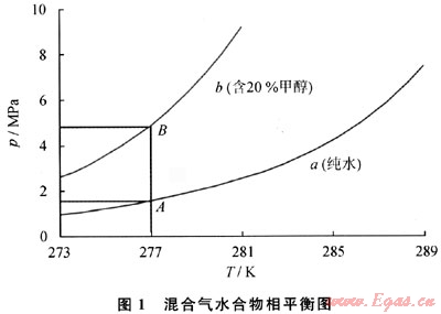 當(dāng)介質(zhì)中加入一種化學(xué)劑時,天然氣水合物形成的平衡條件就會改變,這就是熱力學(xué)抑制劑的作用機理。熱力學(xué)抑制劑可以使介質(zhì)的相平衡曲線上移,如圖1所示,同一混合氣在加入20%的甲醇后,其生成天然氣水合物的平衡曲線就由a線升高到b線,即當(dāng)管道的運行溫度為277K時,加入甲醇后,管道中當(dāng)壓力高于4.85MPa時才會生成天然氣水合物。天然氣水合物生成壓力遠高于加入甲醇前的1.55MPa,這對于天然氣的輸送非常有利。目前2種最主要的熱力學(xué)抑制劑甲醇和乙二醇得到了廣泛應(yīng)用。相對來說,甲醇用得更廣泛,可以用于油氣混輸管道和天然氣管道2種系統(tǒng),且對含鹽高的系統(tǒng)效果更好;而乙二醇一般用于含水非常少的天然氣輸送系統(tǒng)中??梢哉f熱力學(xué)抑制已經(jīng)是目前石油天然氣工業(yè)最主要的天然氣水合物防治手段。