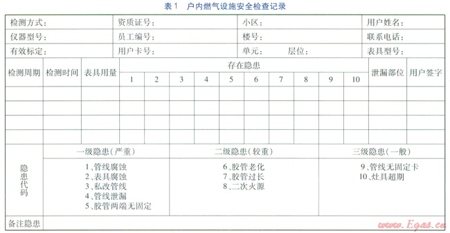 鑒于以上思路,以戶內(nèi)安檢崗位為例,在戶內(nèi)發(fā)生爆炸、爆燃等事故后,相關(guān)部門首先要對(duì)燃?xì)膺\(yùn)營部門是否按國家標(biāo)準(zhǔn)執(zhí)行檢查,是否落實(shí)檢查工作等問題進(jìn)行核實(shí),那么核實(shí)的依據(jù)就是戶內(nèi)燃?xì)庠O(shè)施安全檢查記錄。我們通常的記錄只有檢查人、地點(diǎn)、時(shí)間、存在隱患、處理結(jié)果、處理人及用戶簽字等項(xiàng)目,看起來比較完善,但就筆者來看還是差強(qiáng)人意,只是提供了一些表面證據(jù),沒有體現(xiàn)出更深層面的法律效應(yīng)。例如:我們的員工有沒有檢查資質(zhì),有沒有使用專業(yè)的檢測(cè)設(shè)備,檢測(cè)設(shè)備是否按時(shí)標(biāo)定,設(shè)置在戶內(nèi)的燃?xì)庠O(shè)施有沒有超出使用年限,燃?xì)庠O(shè)施設(shè)置是否保持原始設(shè)計(jì)等,都沒有在記錄中體現(xiàn)。燃?xì)膺\(yùn)營管理者應(yīng)該對(duì)其進(jìn)行完善,并在記錄中直觀體現(xiàn),而這幾項(xiàng)問題想要在記錄中得到體現(xiàn)就需要運(yùn)營企業(yè)投入資金來支撐,要對(duì)職工進(jìn)行培訓(xùn)取得資質(zhì),購入檢測(cè)設(shè)備并按時(shí)標(biāo)定。而燃?xì)庠O(shè)施設(shè)置是否保持原始設(shè)計(jì)的問題,筆者認(rèn)為應(yīng)該列入設(shè)備檔案管理,即:對(duì)戶內(nèi)安裝的燃?xì)庠O(shè)施形成影像記錄,儲(chǔ)存在計(jì)算機(jī)內(nèi),可隨時(shí)調(diào)閱來及時(shí)掌握燃?xì)庥脩羰欠襁M(jìn)行過更改。戶內(nèi)燃?xì)庠O(shè)施安全檢查記錄見表1。