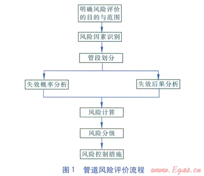 風(fēng)險(xiǎn)評(píng)價(jià)是指識(shí)別出對(duì)管道安全運(yùn)行產(chǎn)生不利影響的風(fēng)險(xiǎn)因素,評(píng)價(jià)事故發(fā)生的可能性和后果,綜合得到管道風(fēng)險(xiǎn)大小,并提出相應(yīng)風(fēng)險(xiǎn)控制措施的分析過程[6]。風(fēng)險(xiǎn)評(píng)價(jià)是完整性管理的關(guān)鍵環(huán)節(jié),應(yīng)根據(jù)評(píng)價(jià)范圍、復(fù)雜程度采用不同的方法和技術(shù)。管道風(fēng)險(xiǎn)評(píng)價(jià)流程見圖l,其中的幾個(gè)主要環(huán)節(jié)一般為風(fēng)險(xiǎn)因素識(shí)別、失效概率分析、失效后果分析和風(fēng)險(xiǎn)分級(jí)。